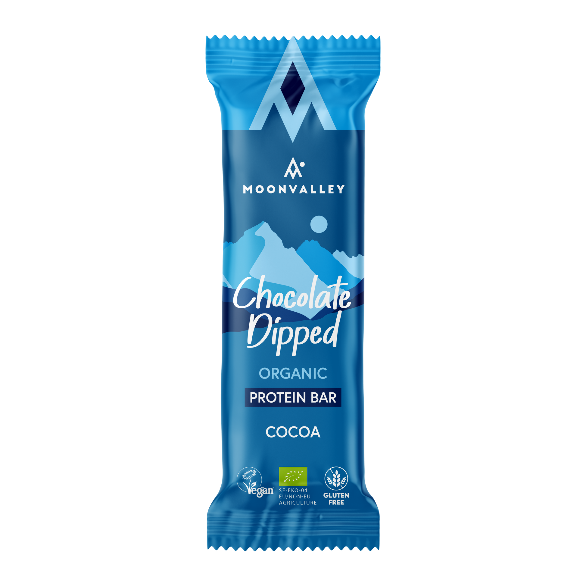 Unn deg hele 12 luksuriøse Moonvalley-øyeblikk med våre veganske kakao-proteinbarer dyppet i sjokolade!